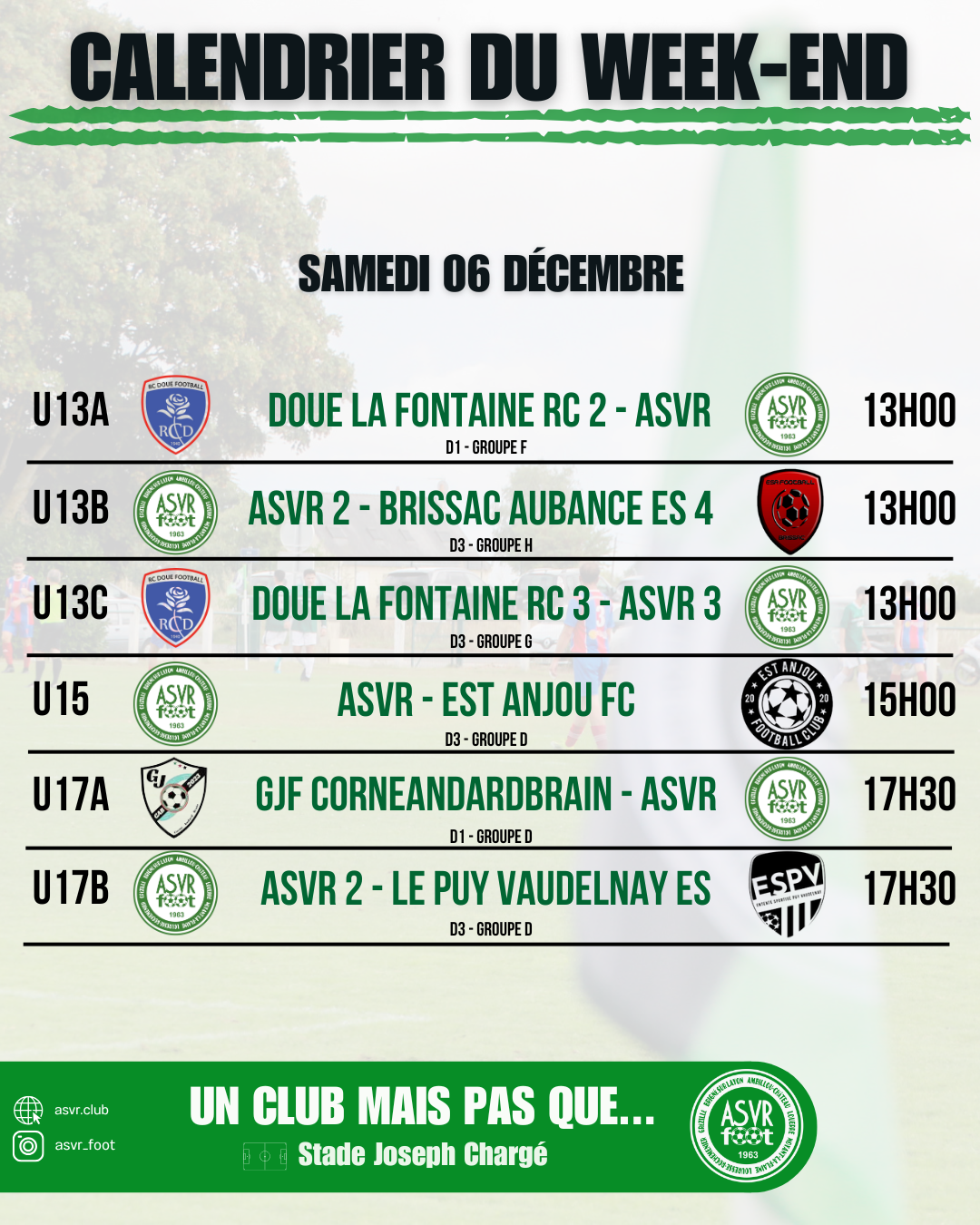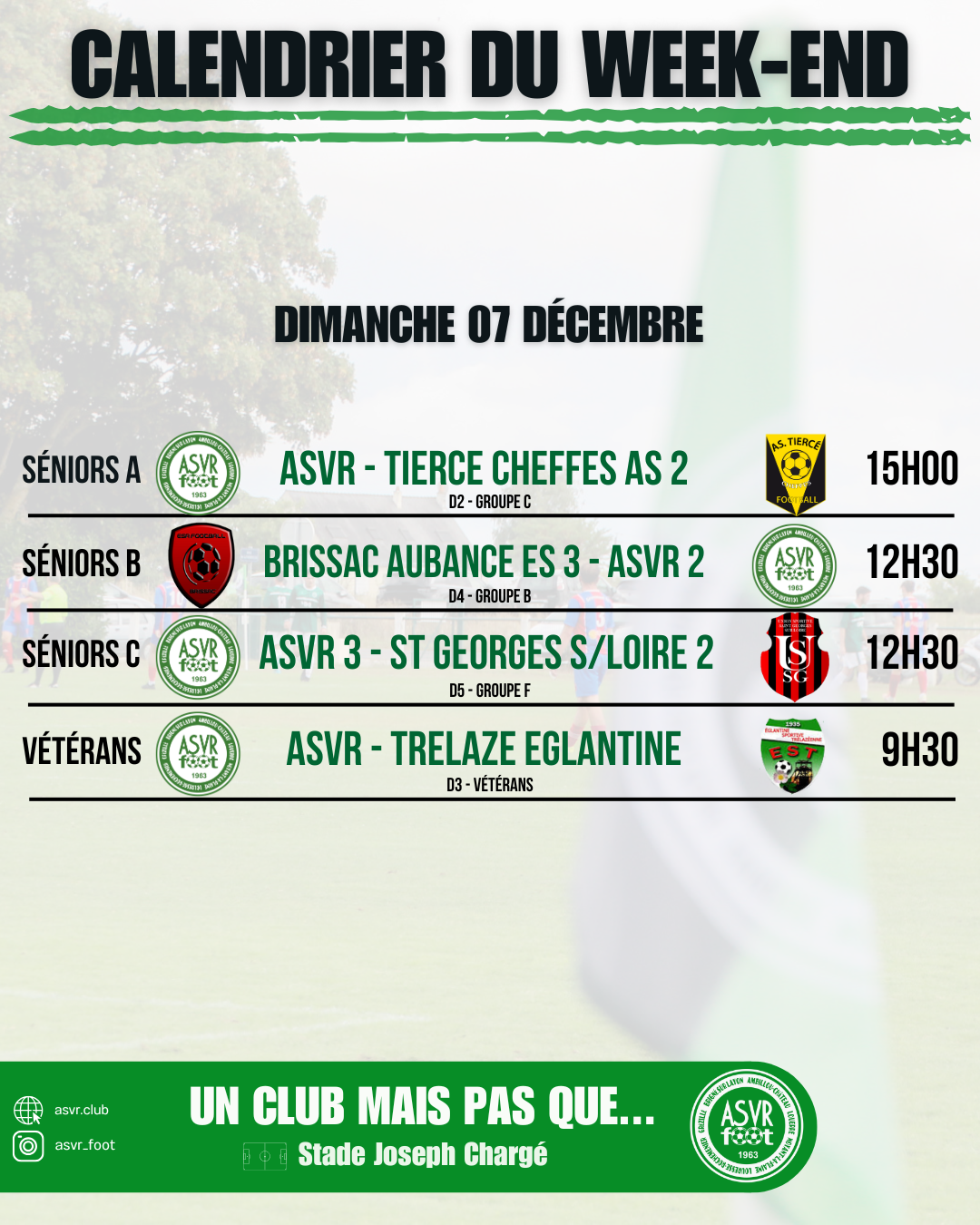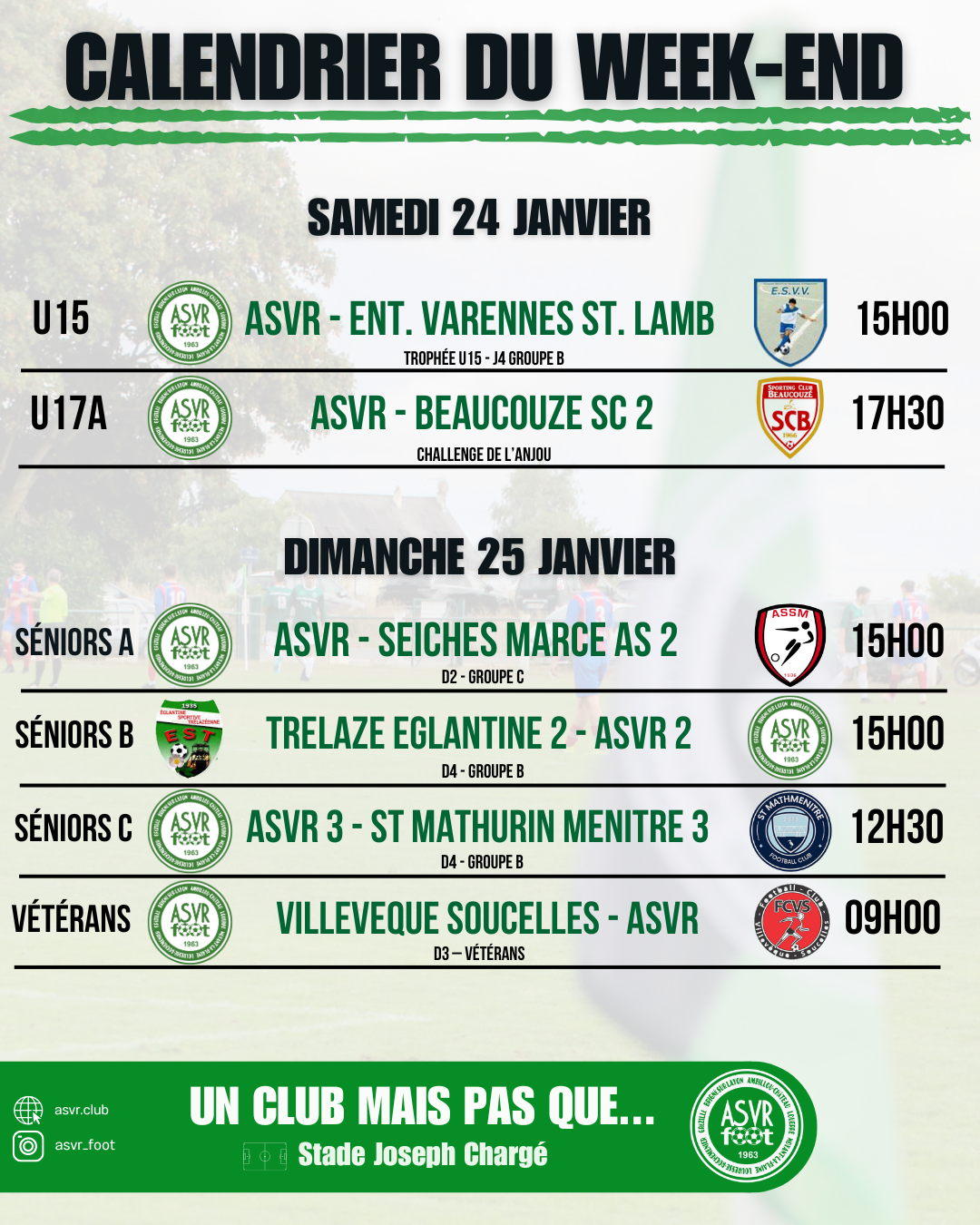 L’ASVR RECRUTE Le club recherche des éducateurs pour les catégories jeunes pour la saison prochaine. Alors si tu souhaites t’investir, transmettre la passion du foot et apprendre le foot aux jeunes, n’hésites pas à contacter le président, Marc Martin ! ...